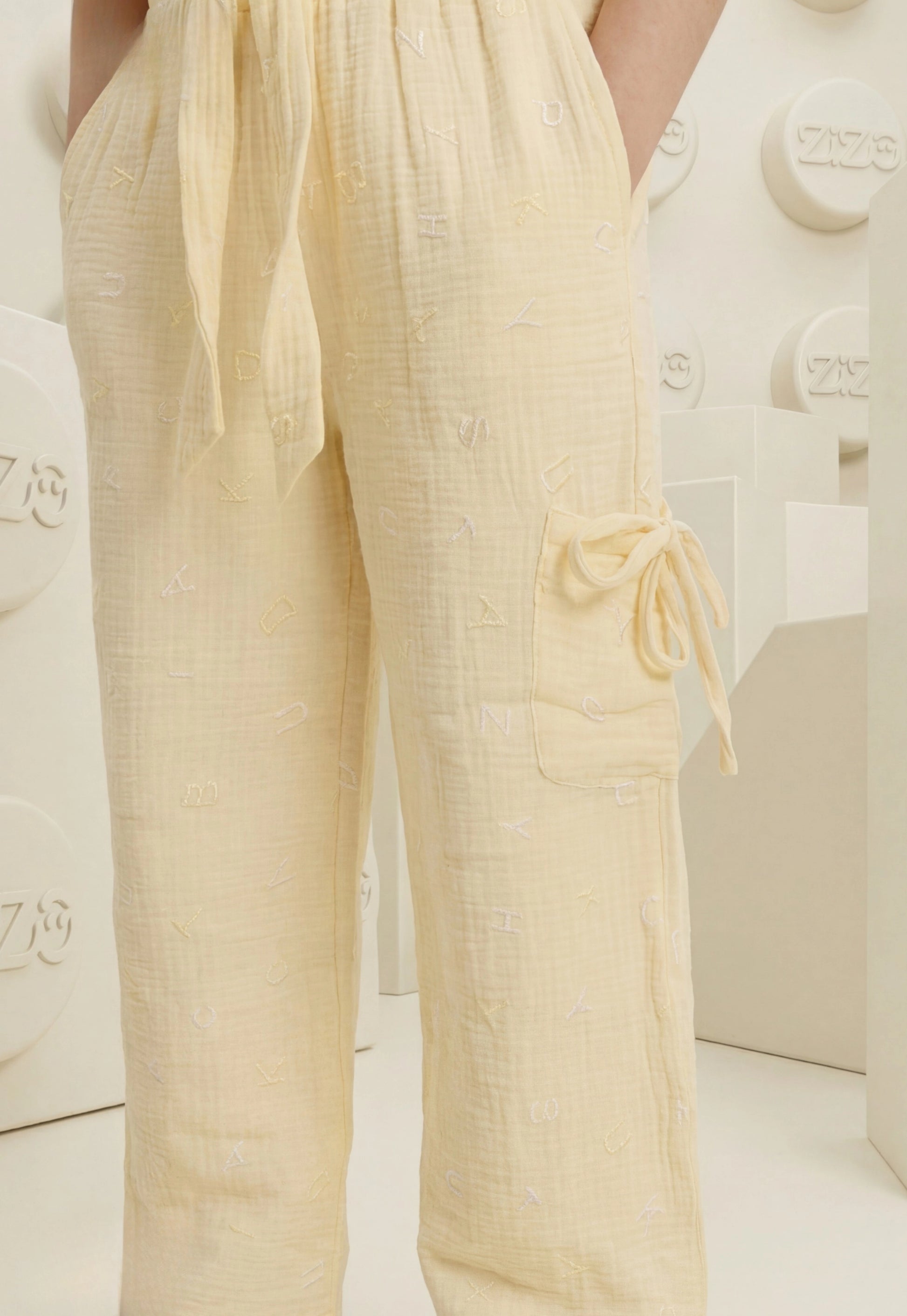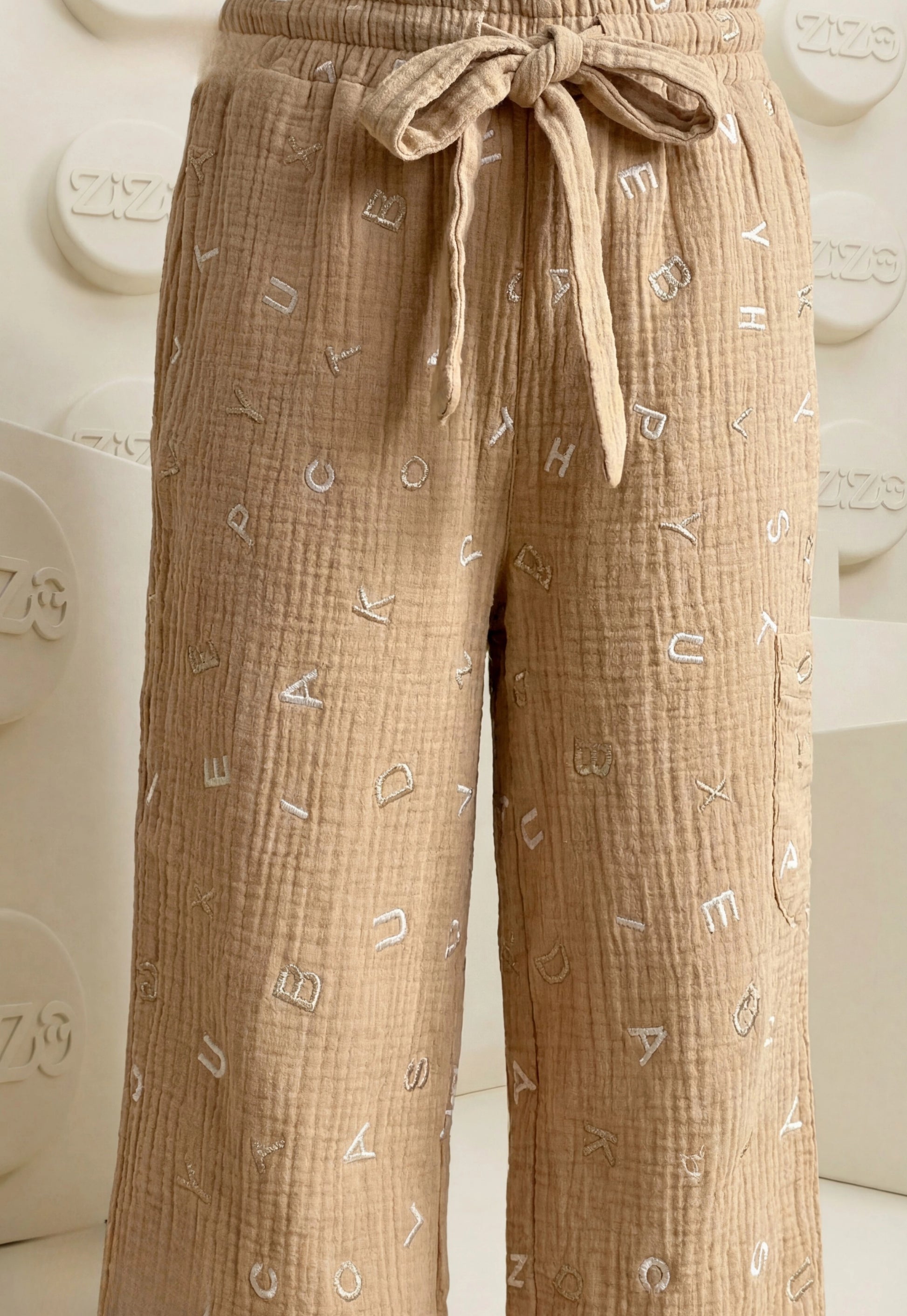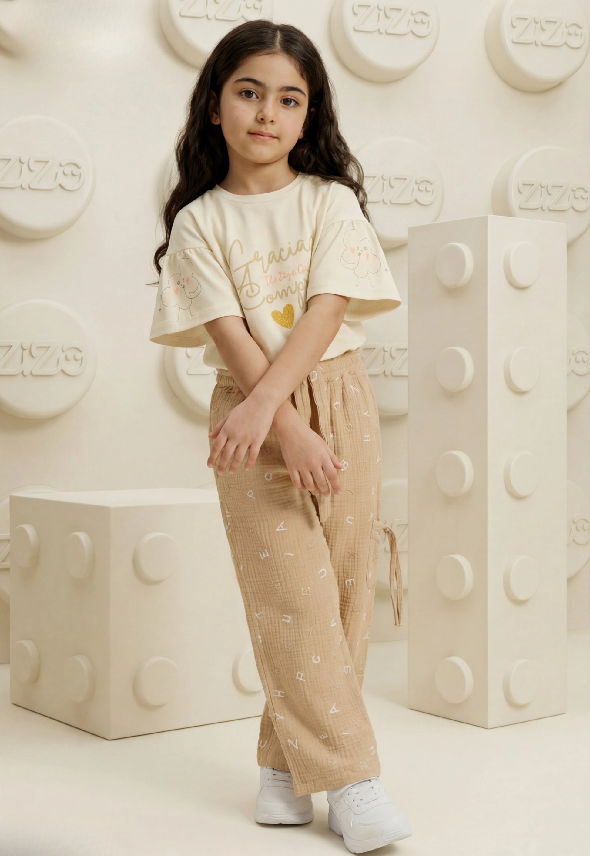 e set includes a short-sleeved top featuring a playful design with the text “UP YOUR LIFE” and a colorful floral graphic, adding a fun and trendy vibe. It is paired with matching peach pants that offer a comfortable fit with an elastic waistband, ensuring ease of movement. The outfit is completed with white sneakers, making it suitable for both sleepwear and casual wear. Made from high-quality, breathable fabric, this pajama set provides durability and comfort for active young girls.