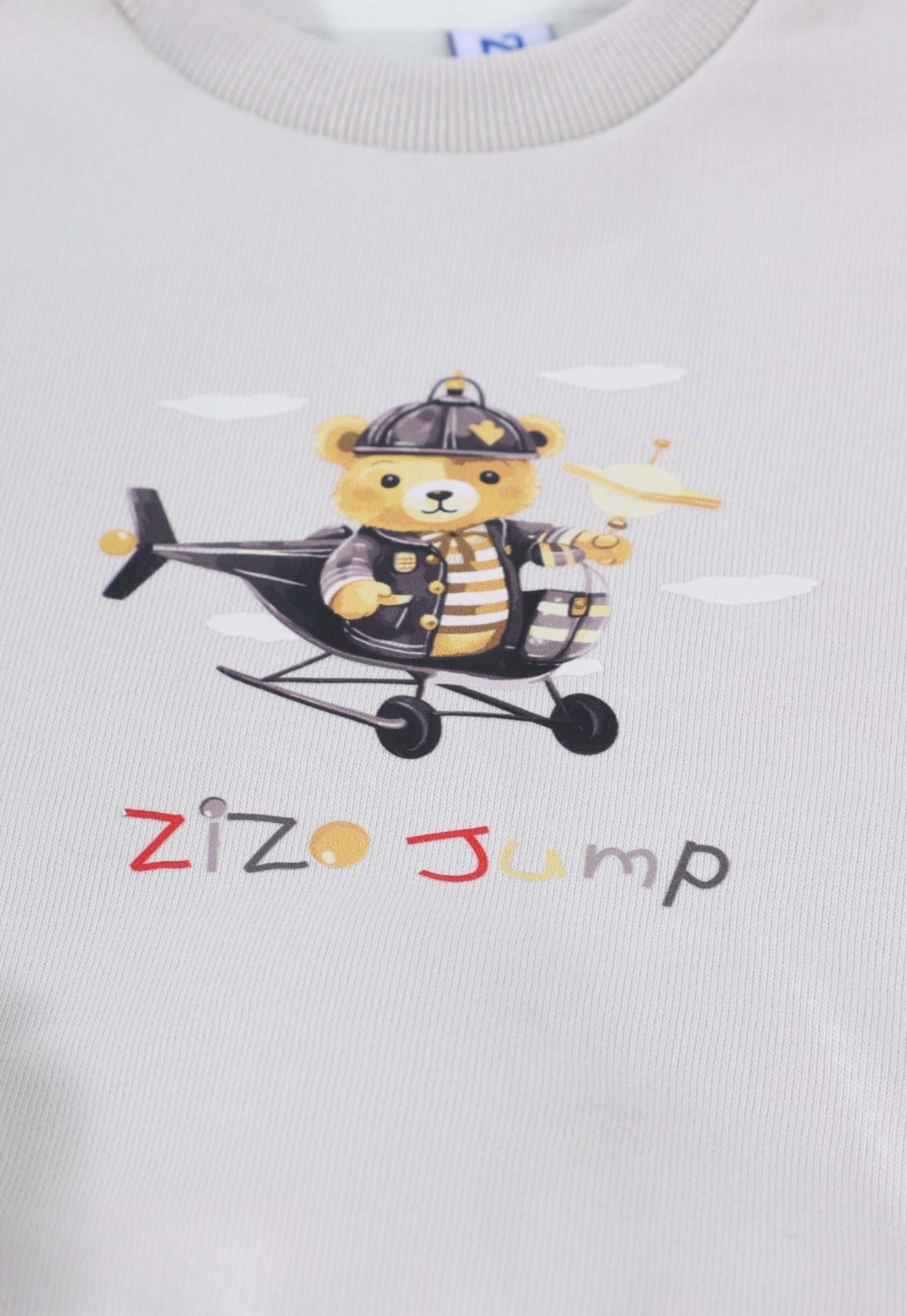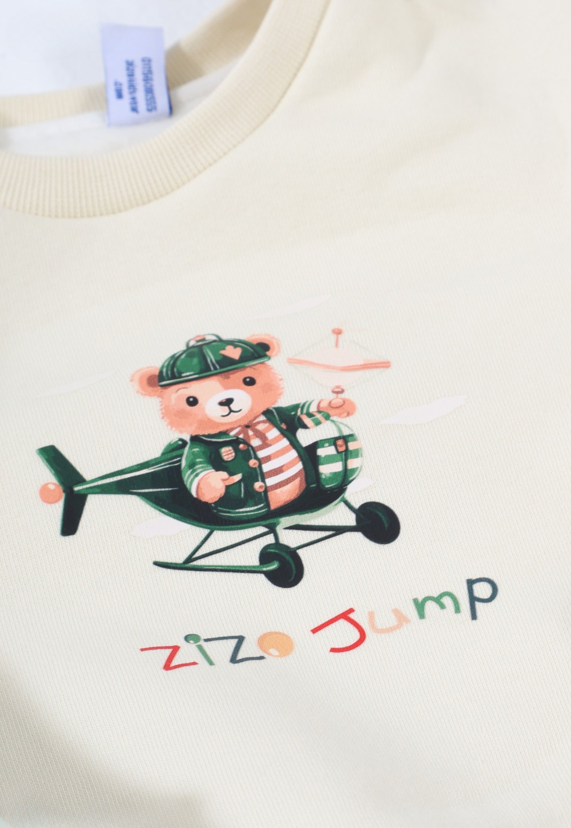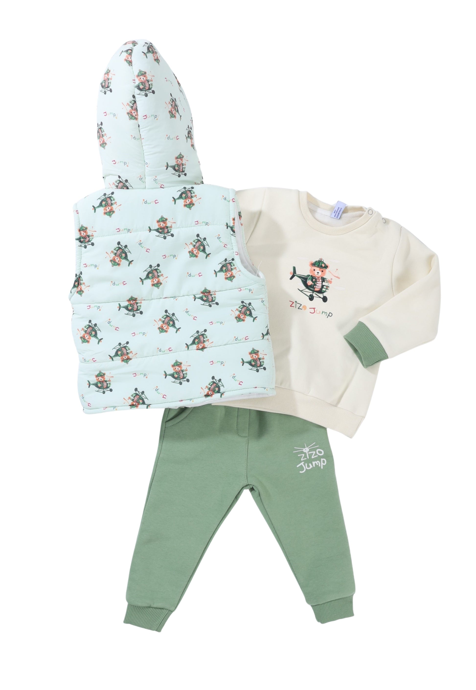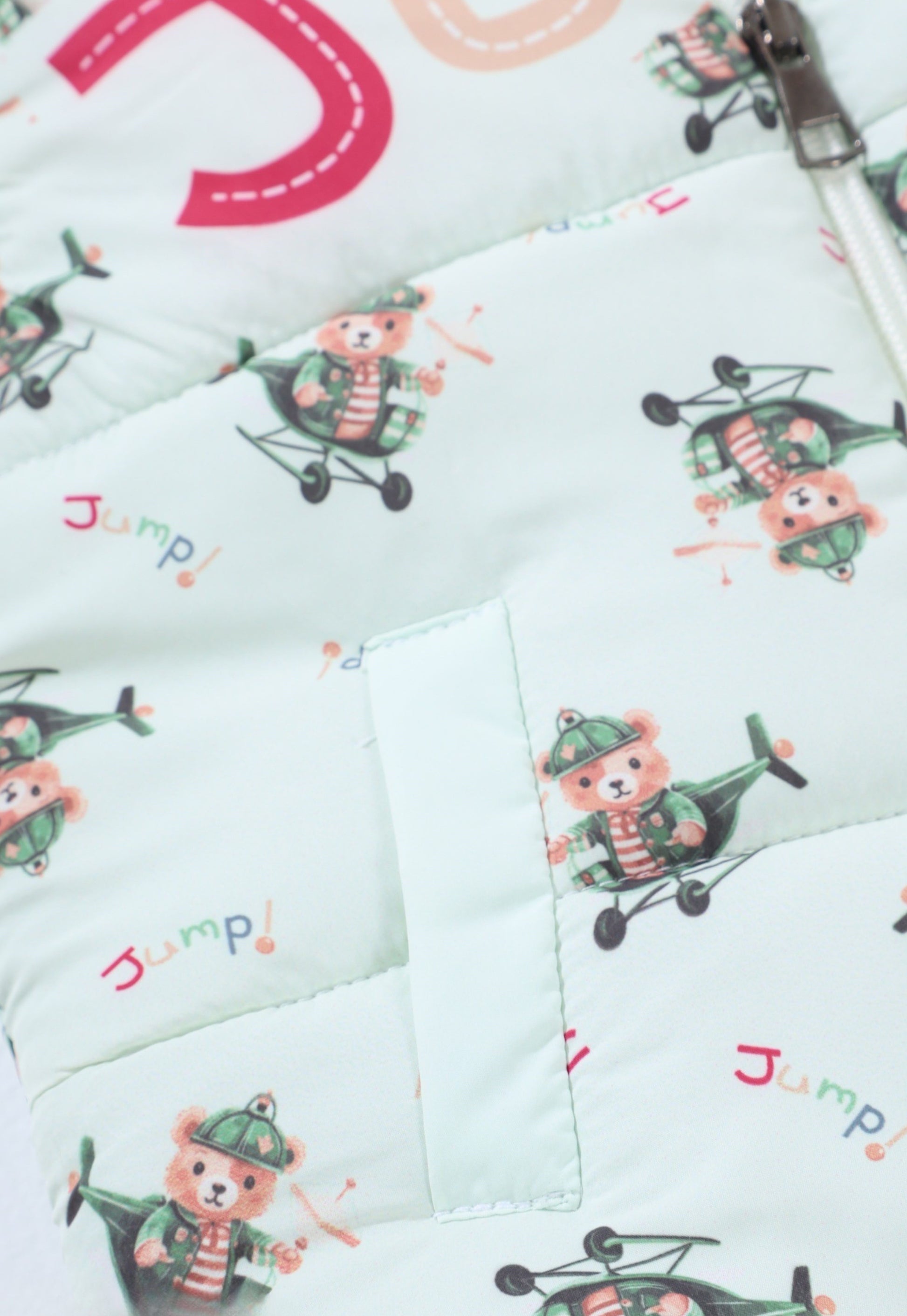 It consists of a padded vest with a cute pilot bear print, a soft hoodie with a pilot bear graphic, and Milton pants with a playful printed touch.