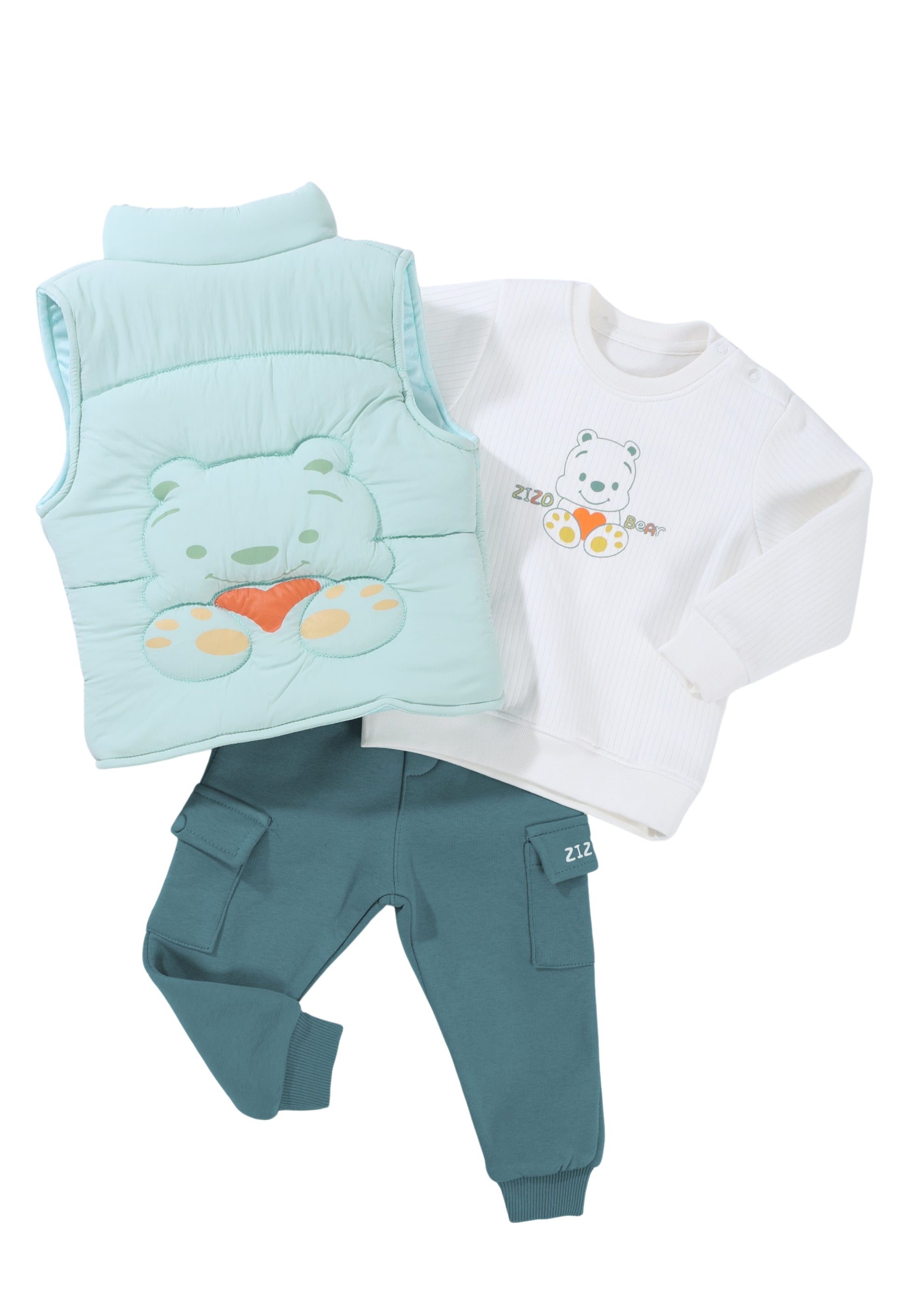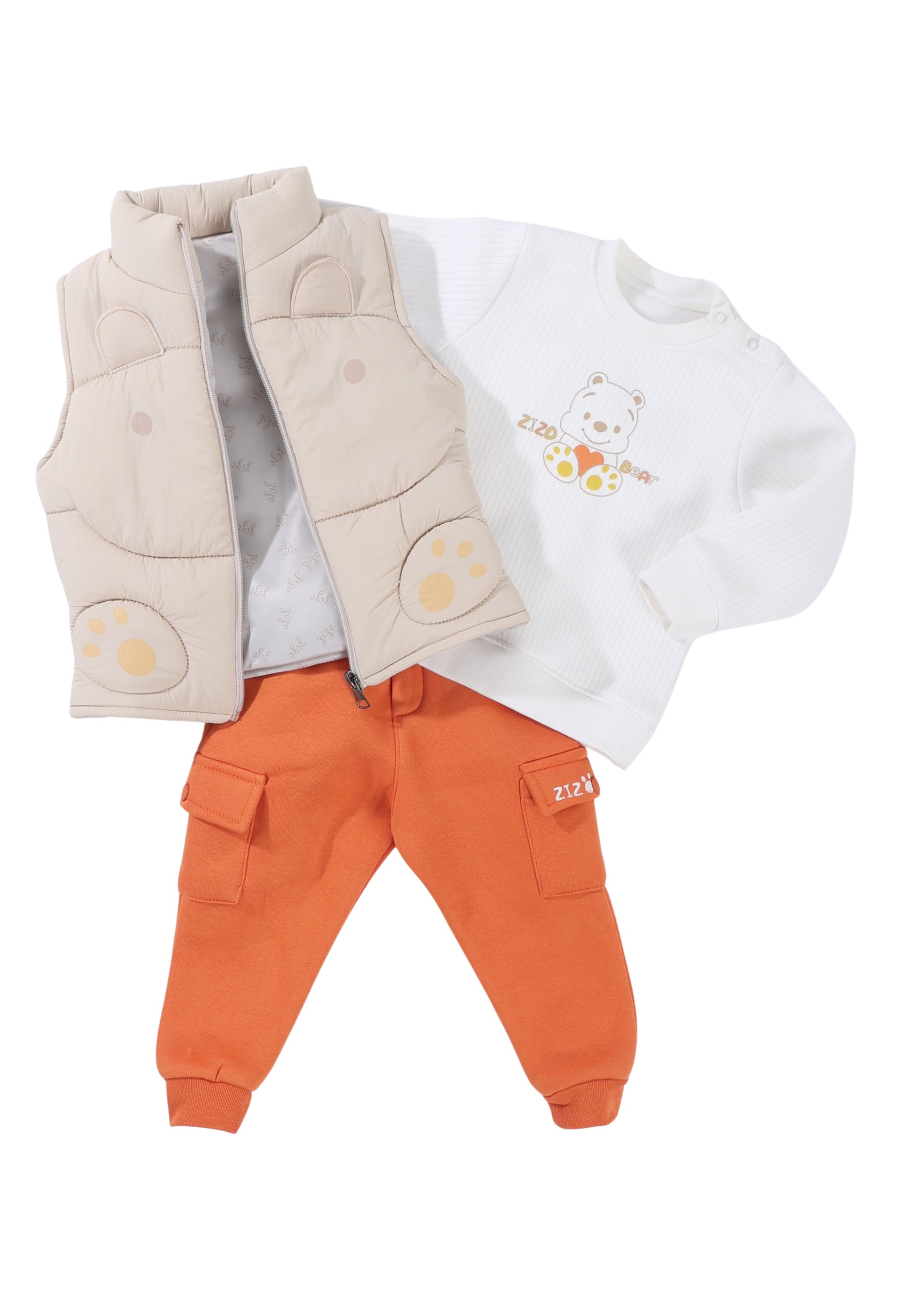 The set includes a padded vest with a prominent bear print on the back, a cotton sweatshirt with a Zizo Bear print, and practical cargo pants with side pockets.