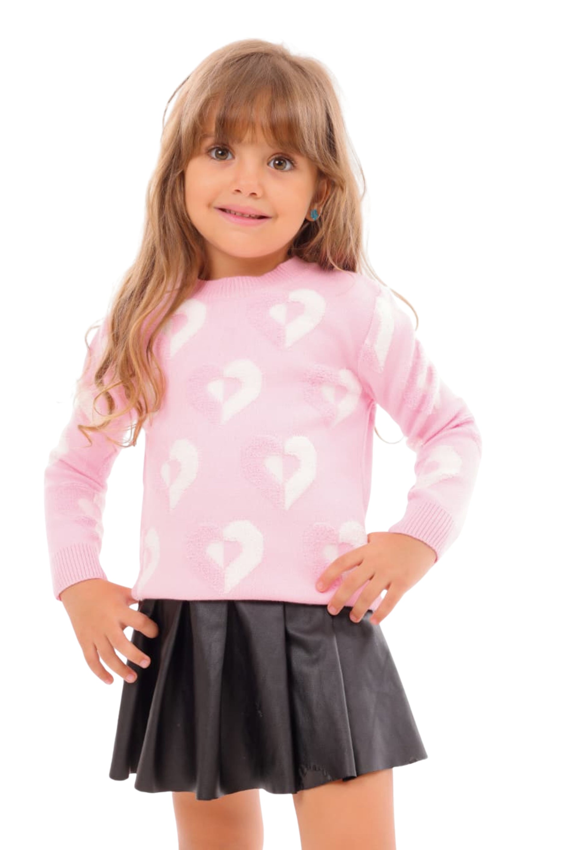 A stylish girls' knitted sweater with a prominent woven heart design that gives a feeling of warmth and softness at the same time.
