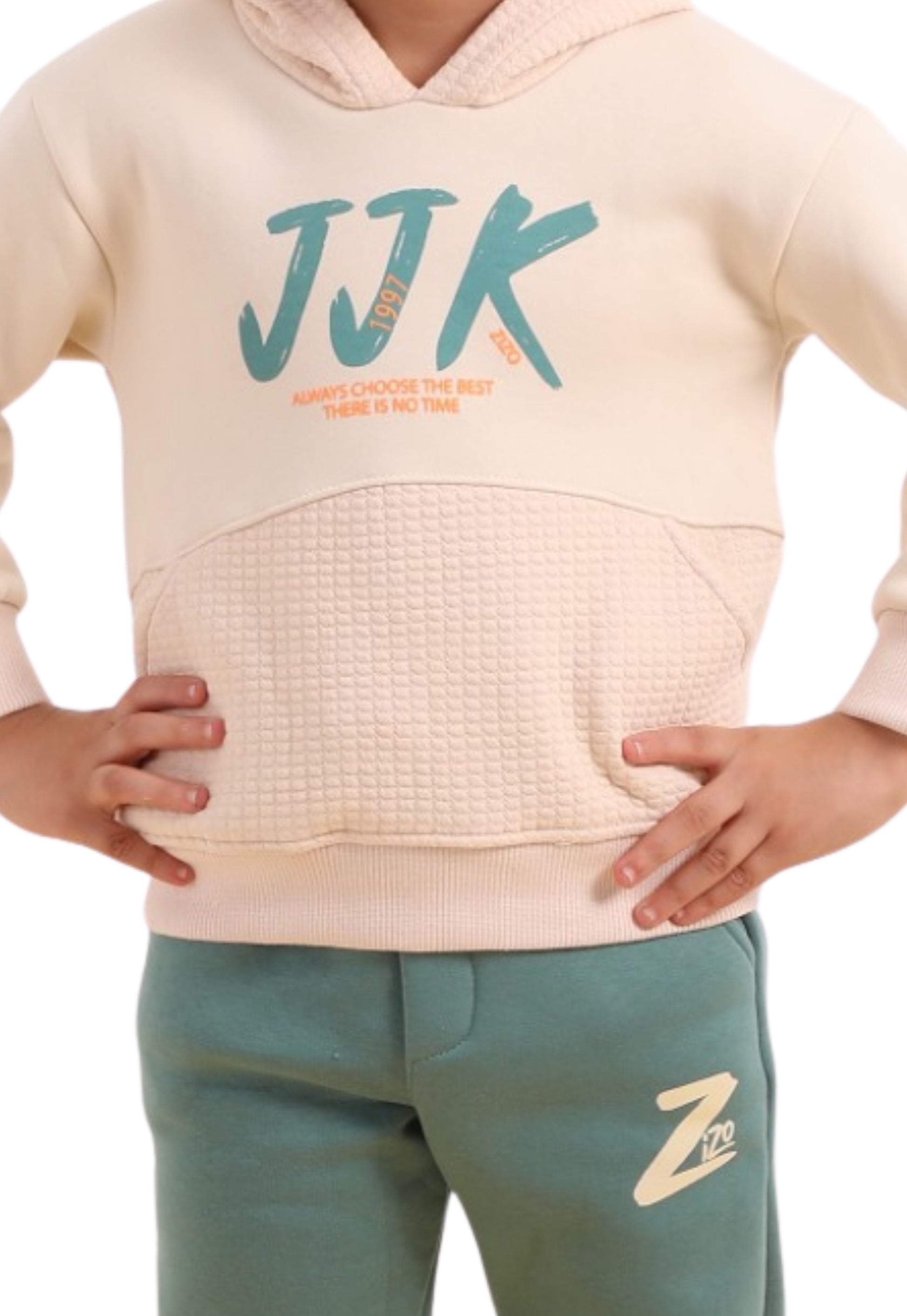 The top piece is a hoodie made of lined Melton fabric with a distinctive design at the bottom featuring raised checkered stitching that adds a different look than usual, with a large JJK print in a raised font and letters printed with a soft matte effect.