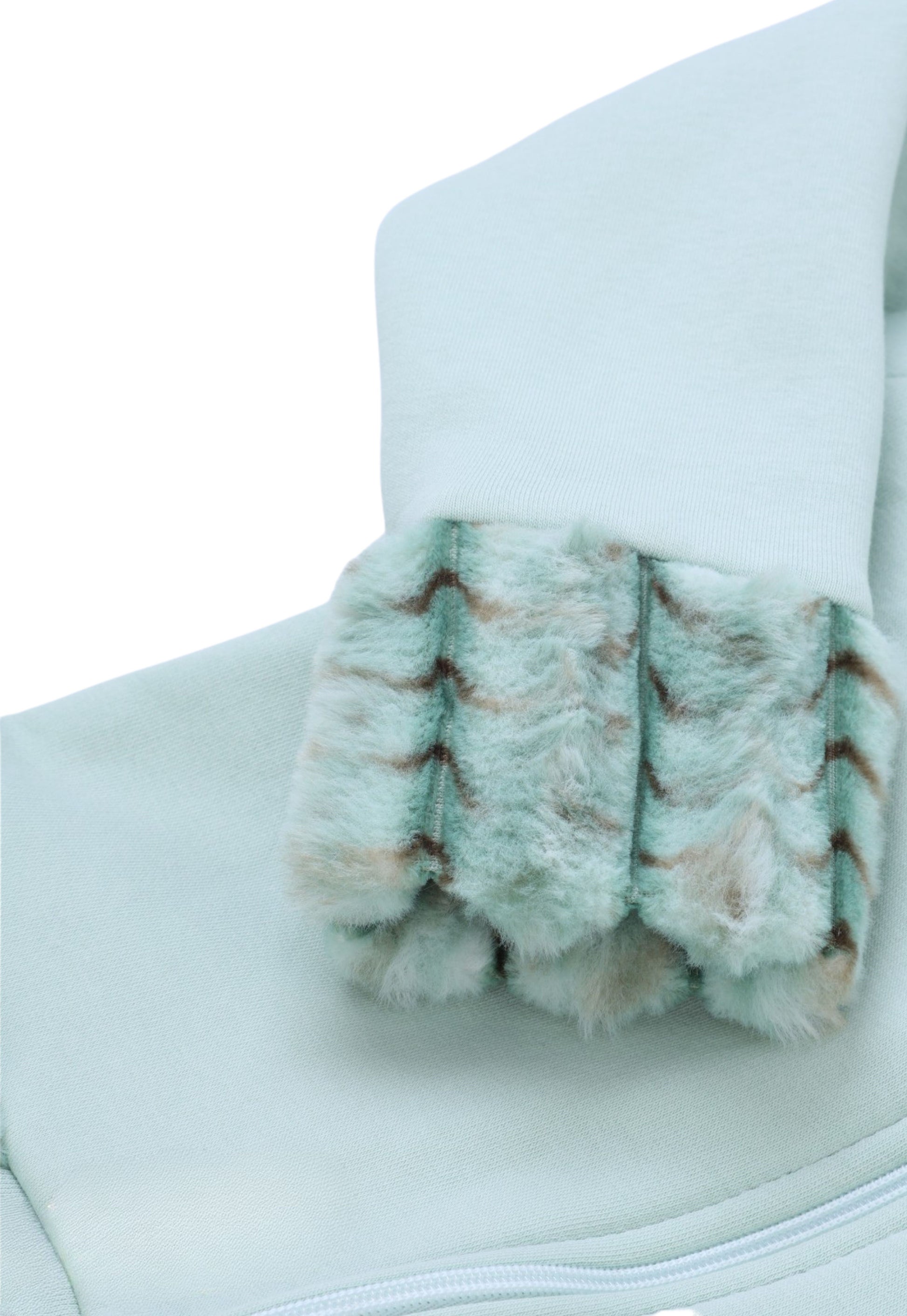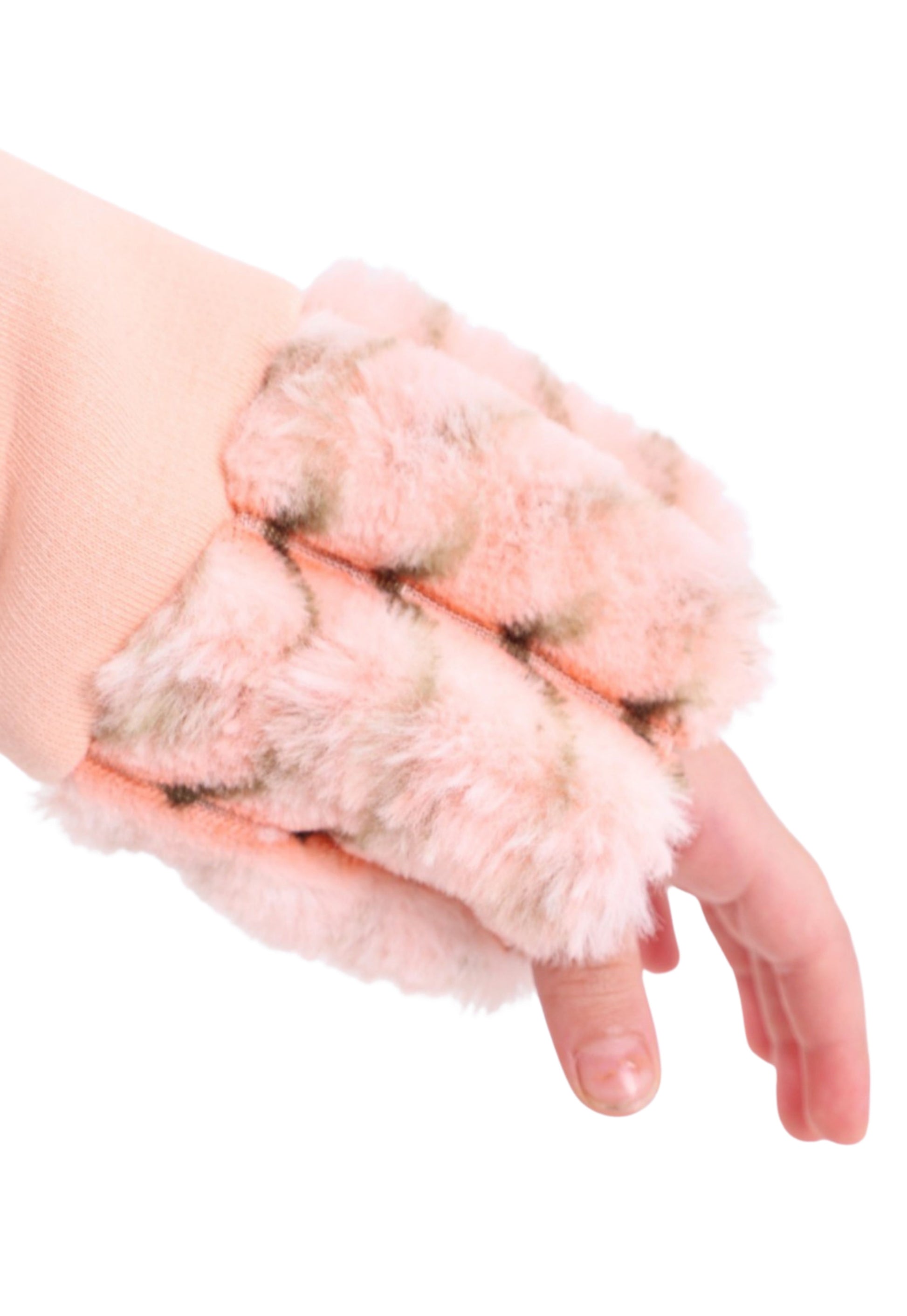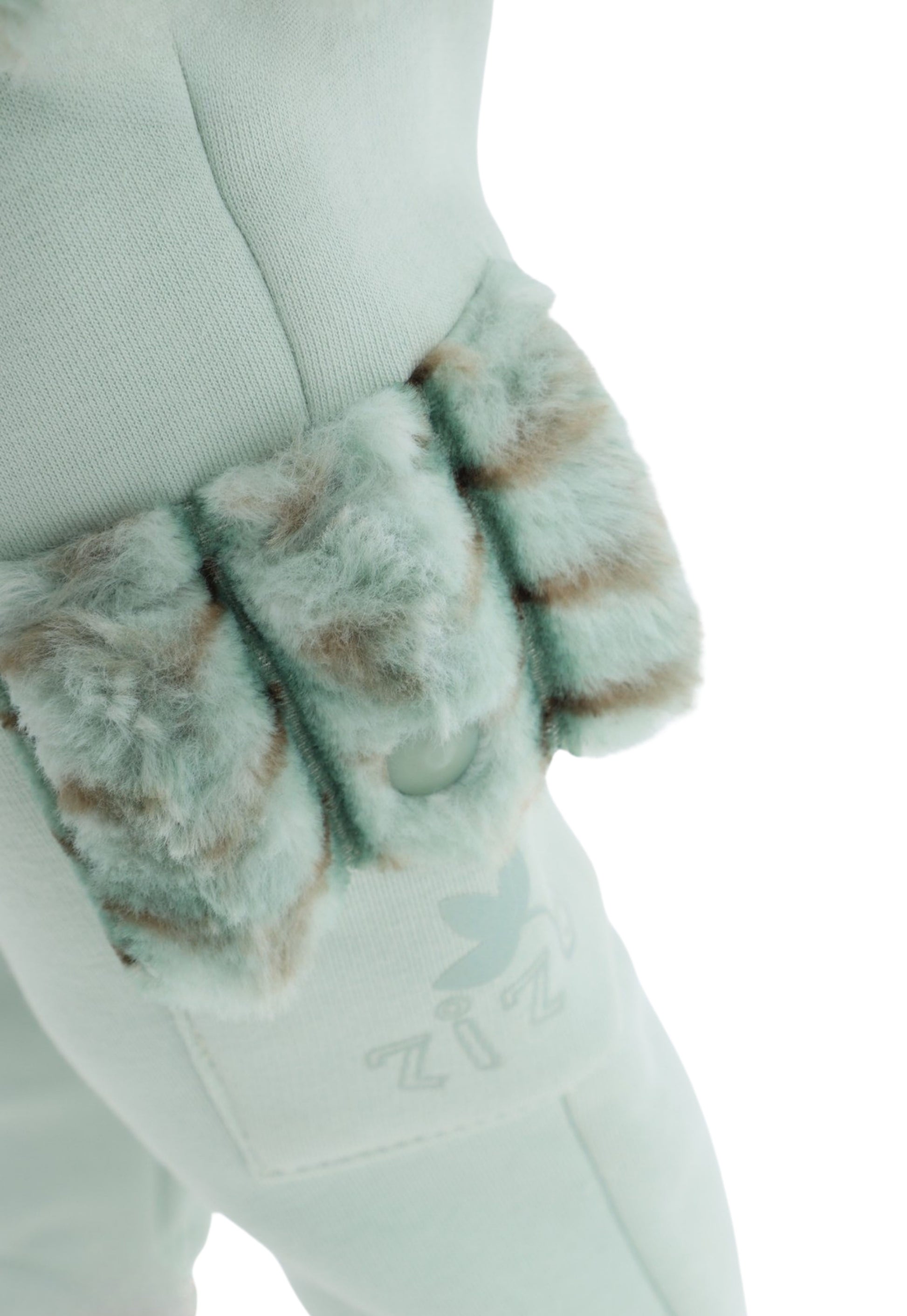 A stylish winter girls' set consisting of a jacket with a front zipper and matching pants, with a distinctive design featuring soft fur details on the sleeves, collar, and hem.