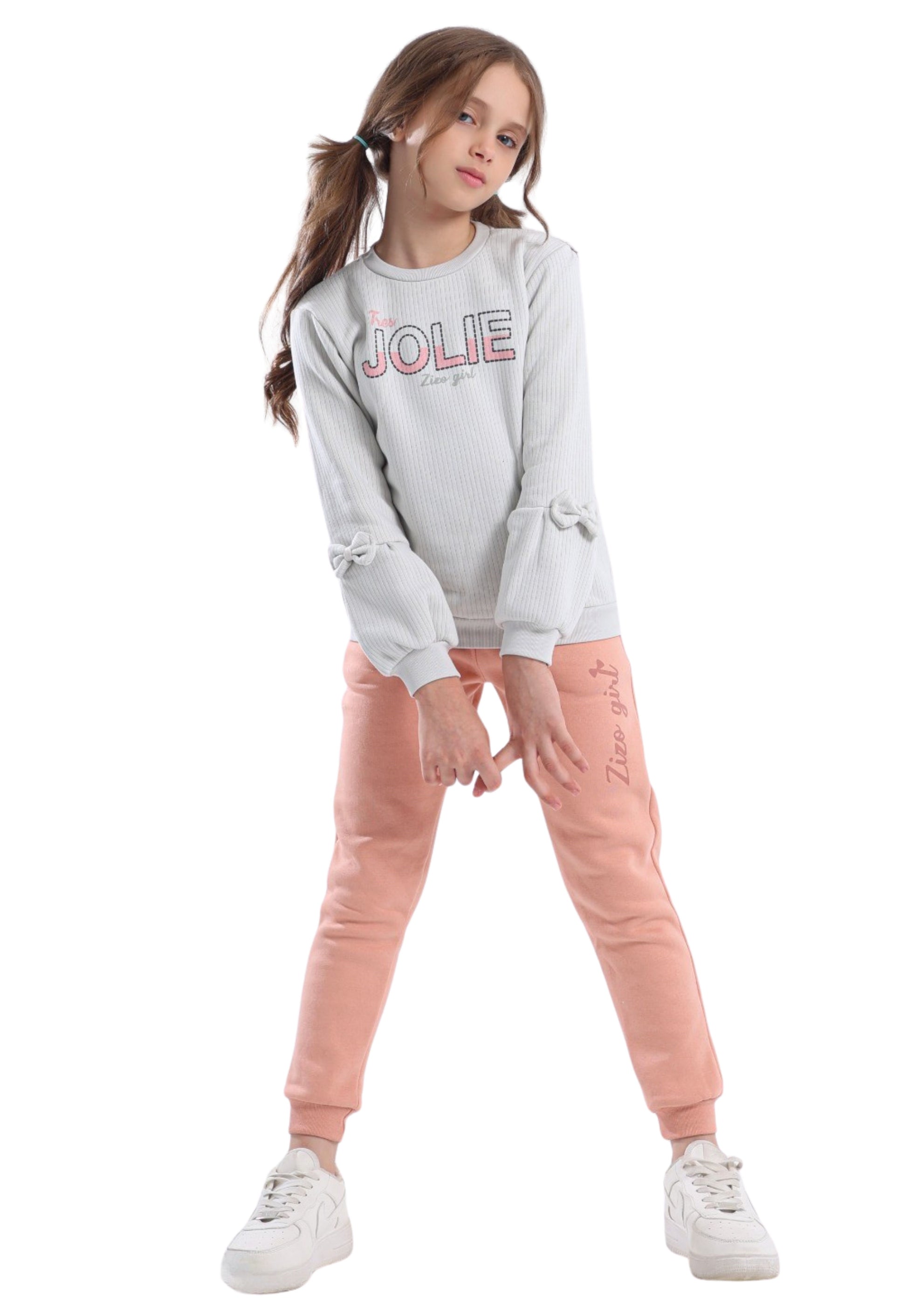 It consists of a ripped cotton blouse with a “JOLIE” print, decorated with small bows on the sleeves, and matching fleece pants bearing the Zizo Girl logo.