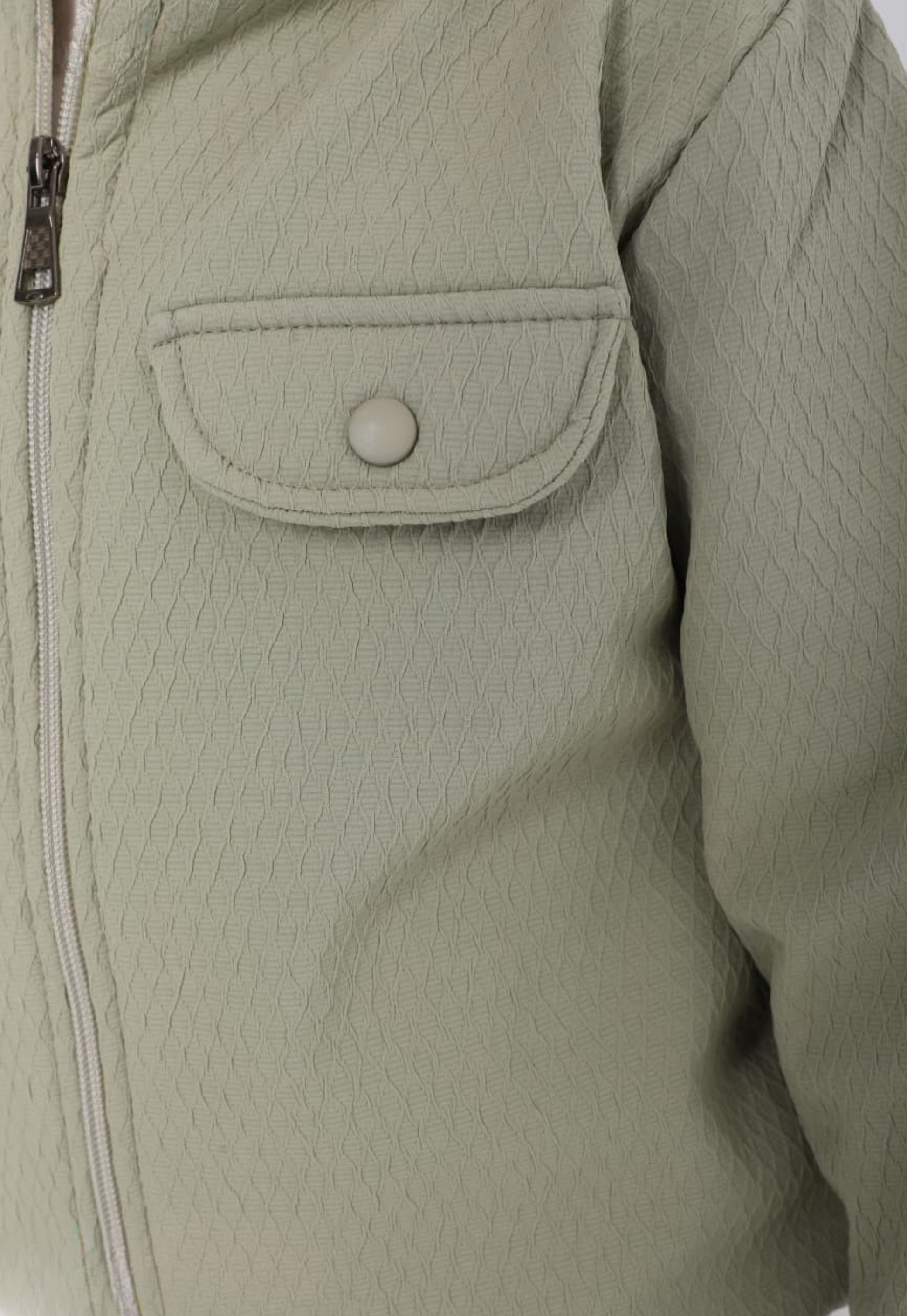 The jacket is made of a quilted material with a distinctive embossed pattern that adds a luxurious feel, with a collar, sleeves, and bottom zipper with two contrast lines that give a modern, youthful touch.