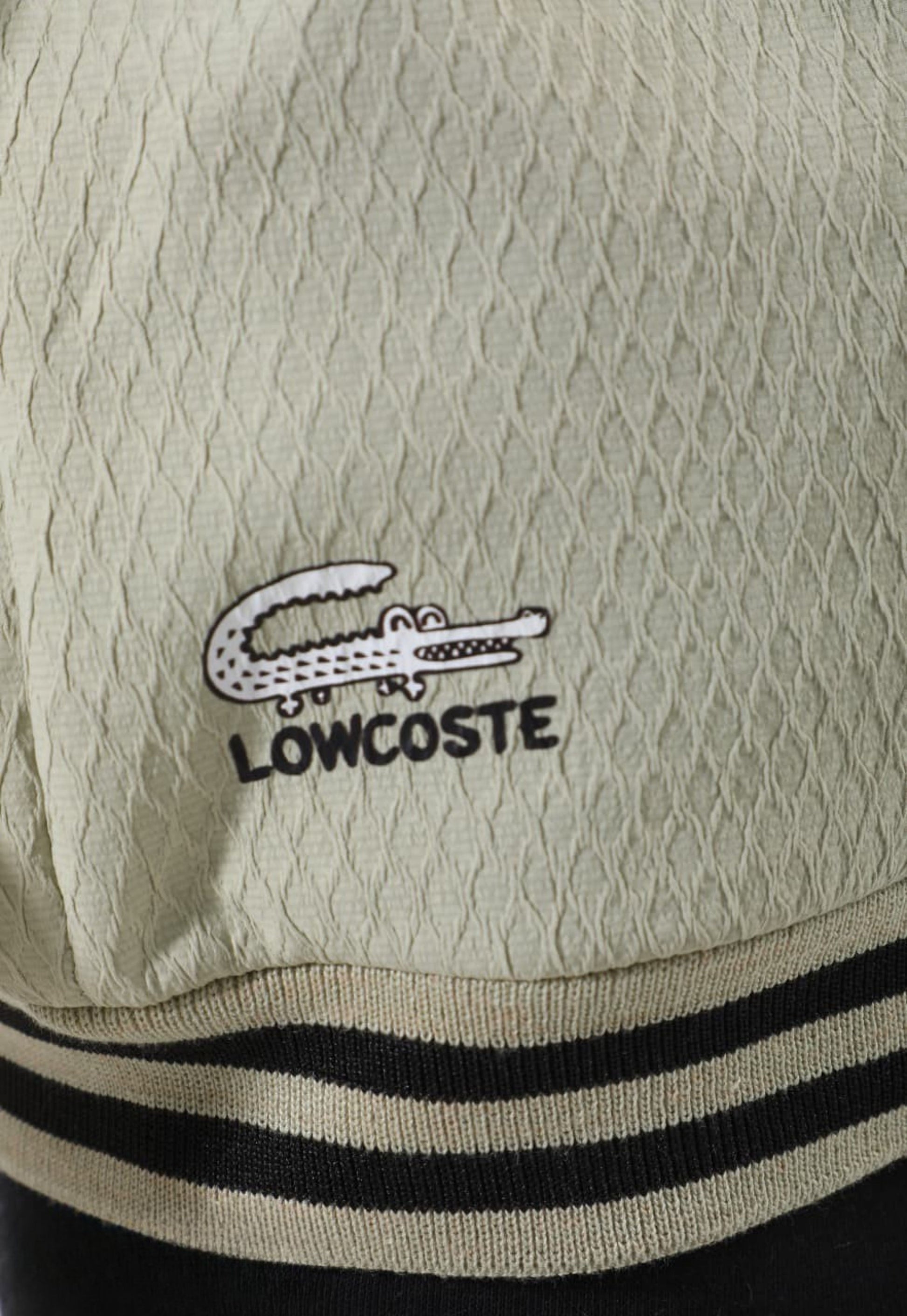 The undershirt features a prominent LOWCOSTE crocodile print in a stylish font and matching colors, while the pants are cotton Melton lined with the ZIZOCOSTE logo on the leg, in a comfortable casual style suitable for movement and activity.