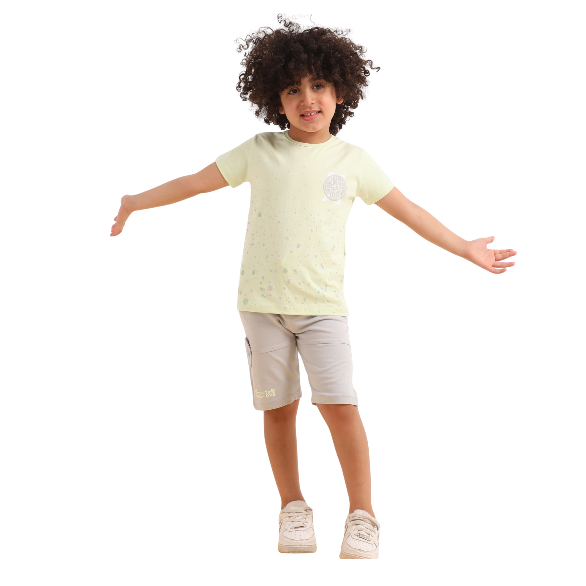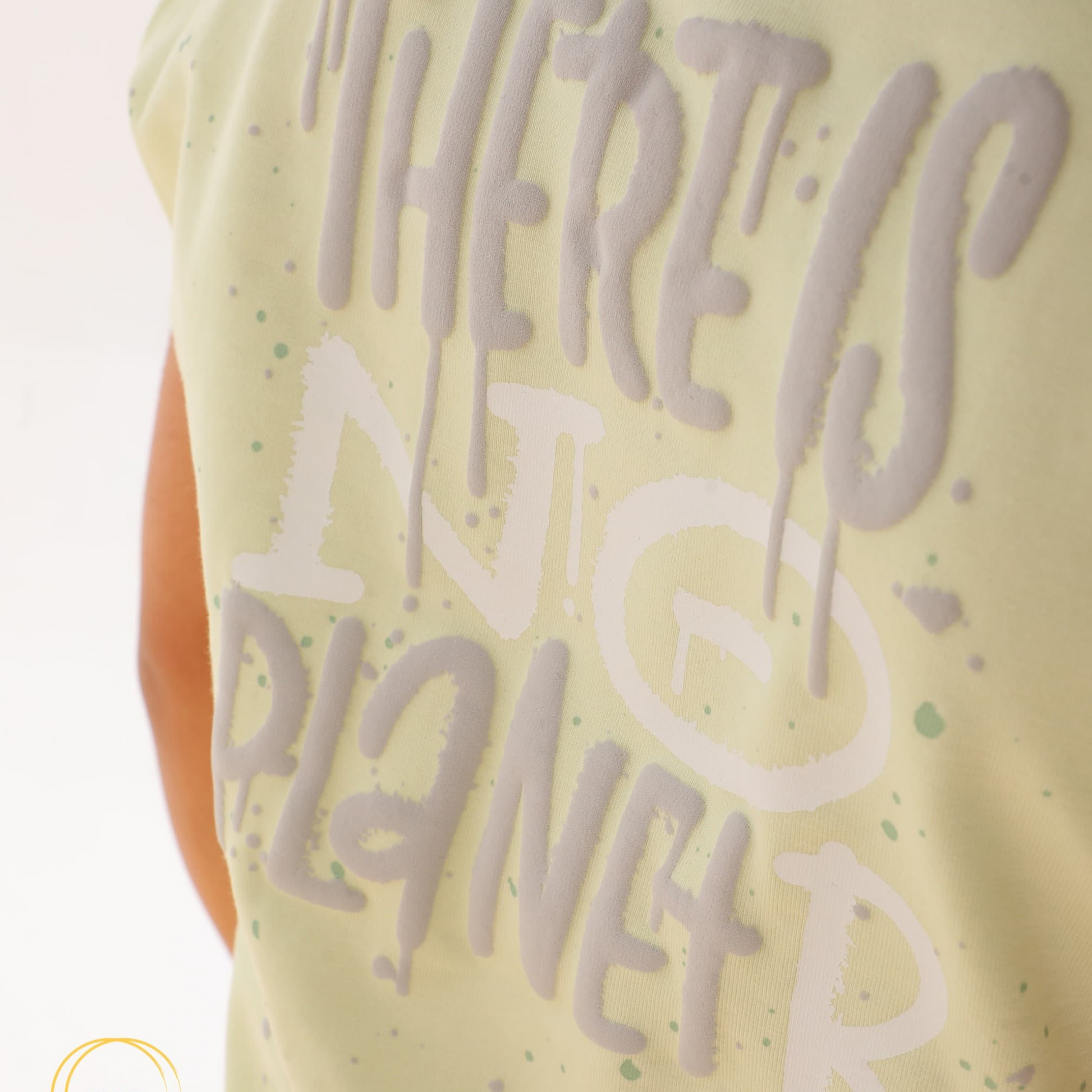 The short-sleeve light yellow T-shirt features a powerful back print that reads: “There is No Planet B”, promoting an eco-conscious message in a fun and inspiring way. Complemented with light grey shorts, the outfit is lightweight and easy to move in, ideal for both playtime and sleep.