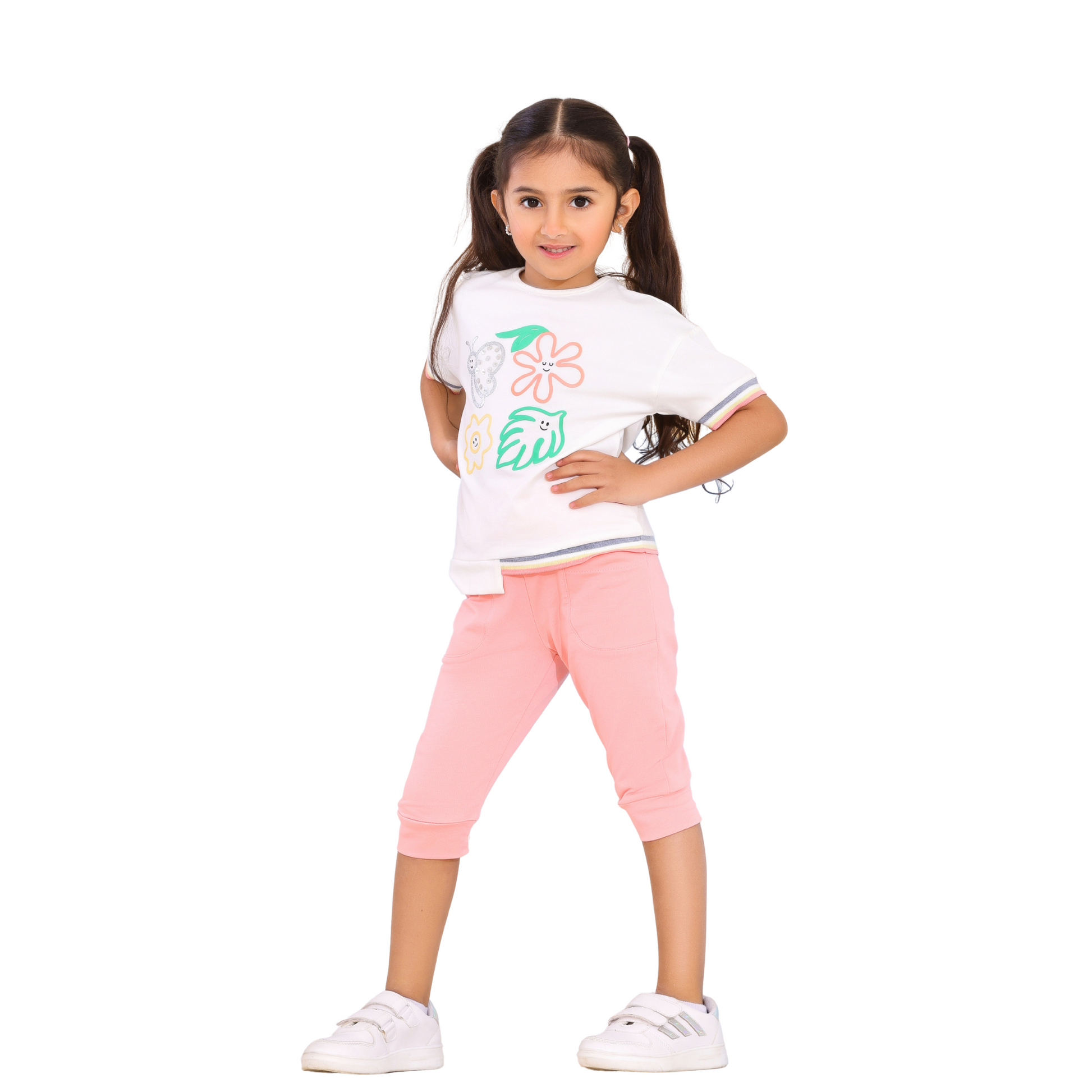 keep your little one stylish and comfy with this adorable girls' pajama set, designed for ages 2 to 5 years. The set features a soft, breathable cotton fabric that’s perfect for everyday wear and bedtime. The white short-sleeve top comes with playful rubber prints of flowers and leaves for a fun, cheerful look. Paired with peach-colored capri pants, this outfit offers both comfort and freedom of movement. Ideal for summer days, playtime, or a cozy night in.