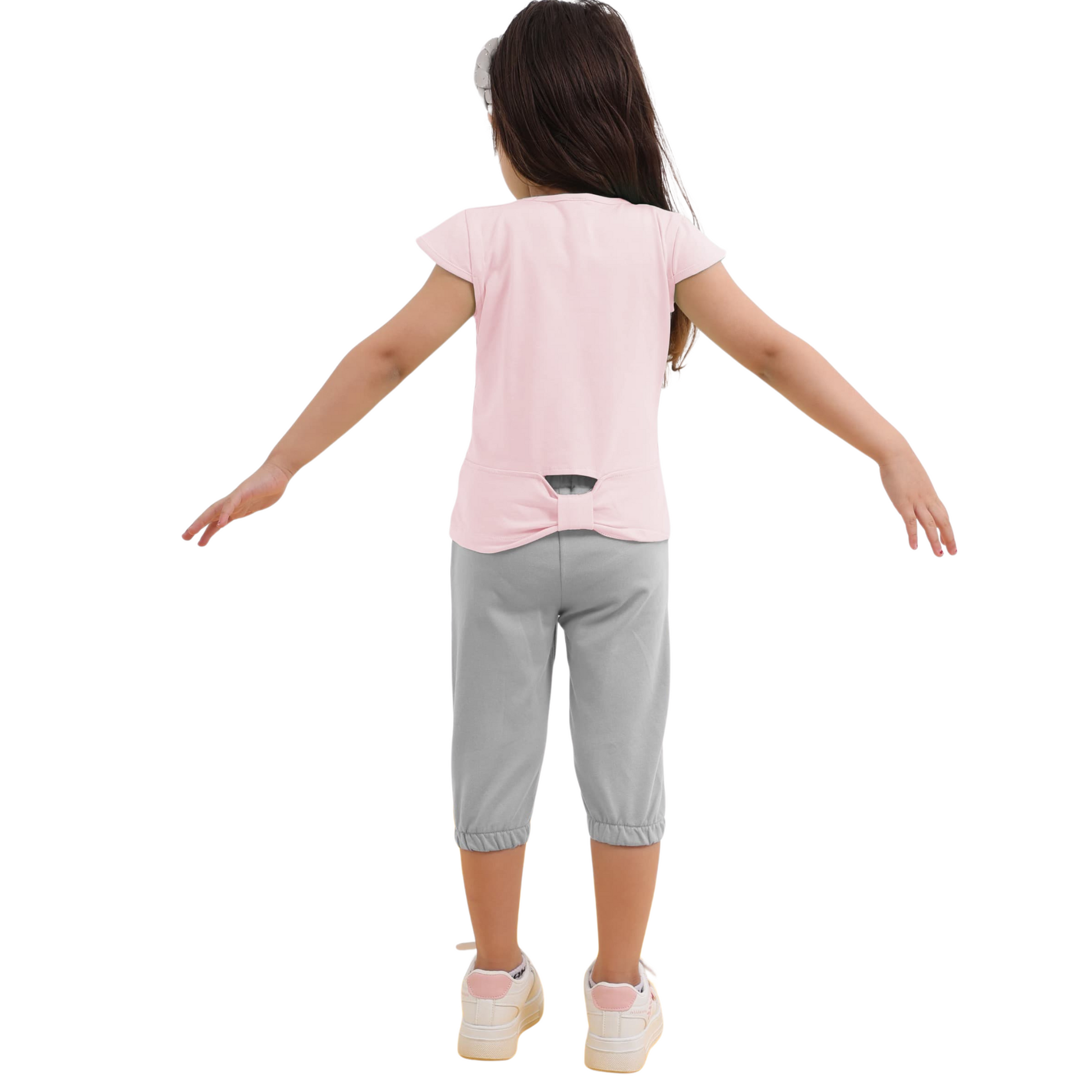 The set features a light pink short-sleeve T-shirt decorated with charming spring-inspired graphics including hearts, flowers, and sparkly details—perfect for little ones who love playful, girly designs. The light grey capri pants come with an elastic waistband and cuffs, providing a secure and flexible fit.