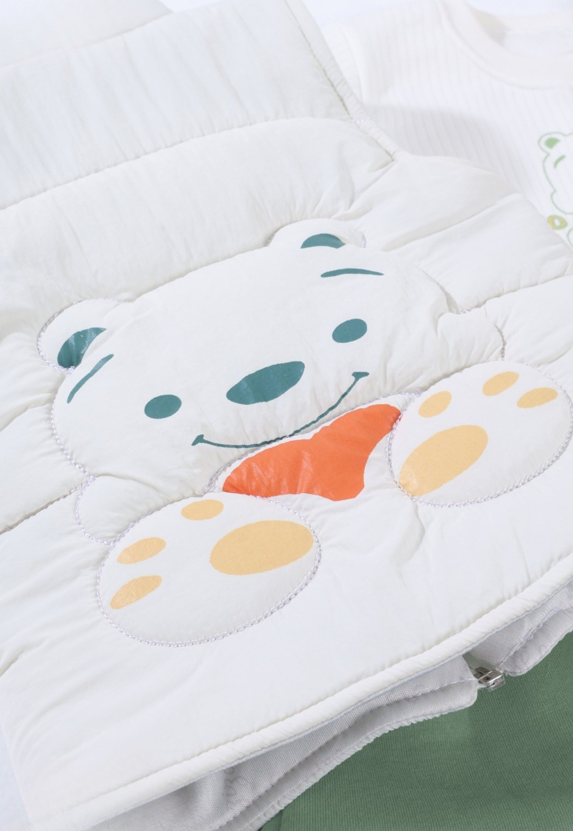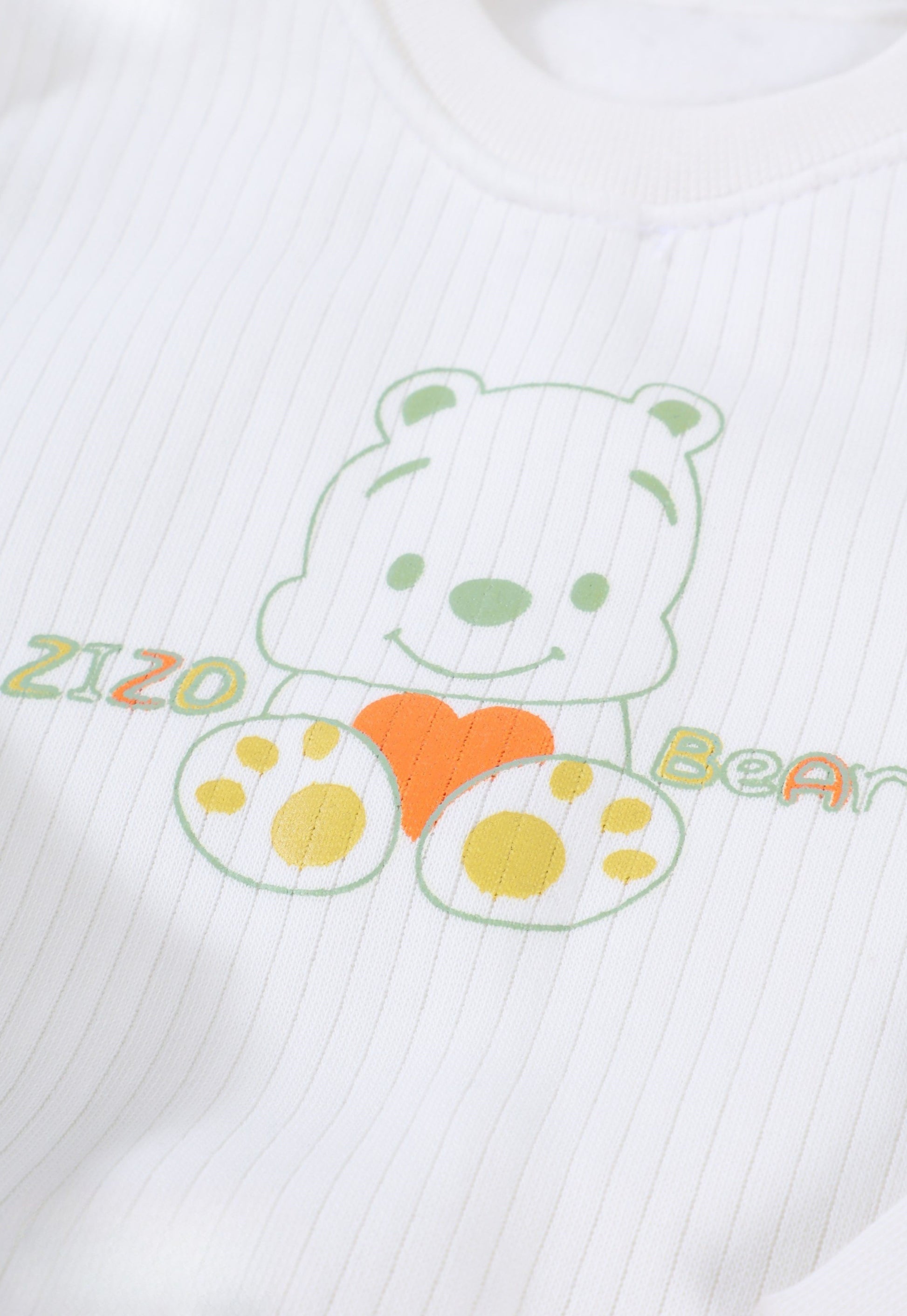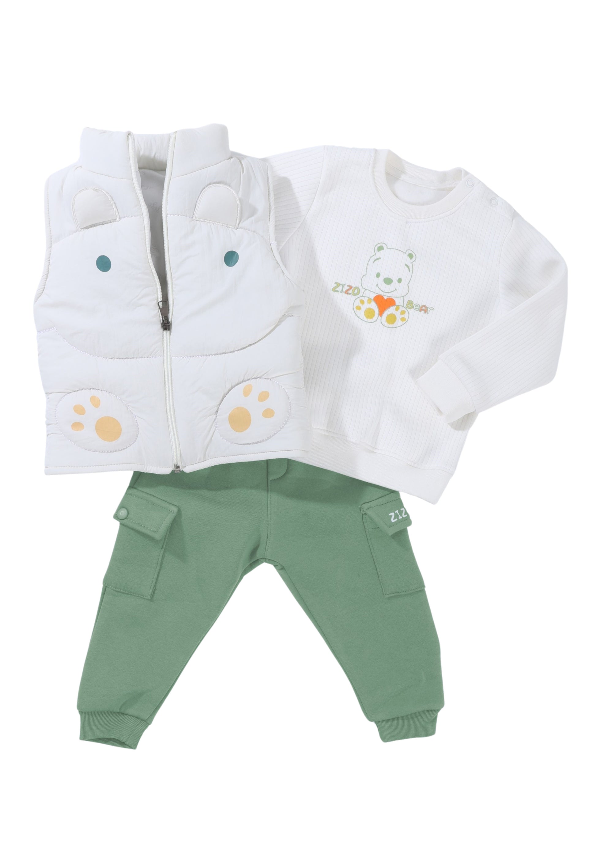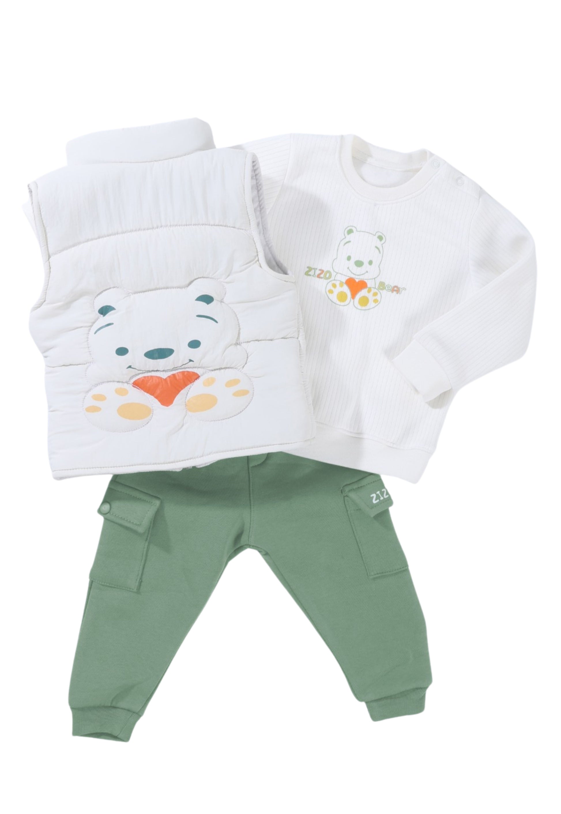 الطقم يحتوي على فيست مبطن برسمة دب بارزة على الظهر، سويتشيرت قطني برسمة الدب Zizo Bear، وبنطلون كارغو عملي بجيوب جانبية.