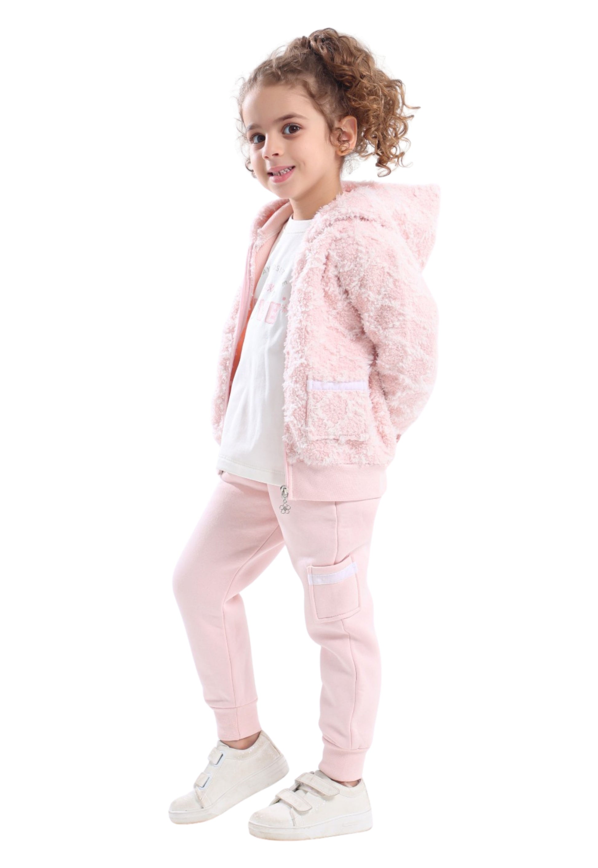 طقم بناتي شتوي أنيق ومريح مكوّن من جاكيت فرو ناعم بقبعة، مع تيشيرت قطني مطبوع وبنطلون عملي بجيب جانبي.