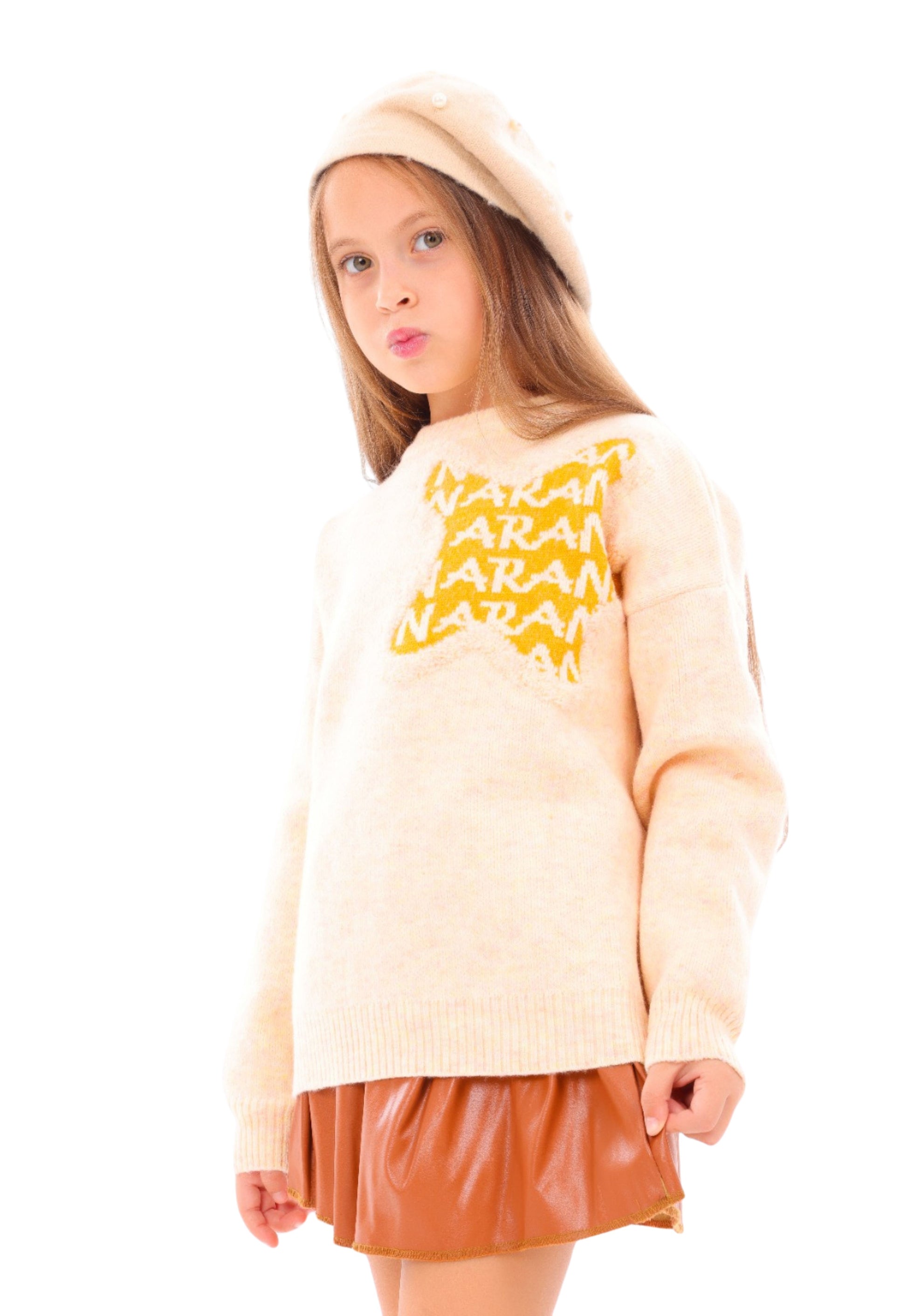 بلوفر تريكو ناعم بتصميم مميز عند الصدر يحمل نقشة مطبوعة بشكل عصري تضيف لمسة جريئة وبناتية في نفس الوقت.