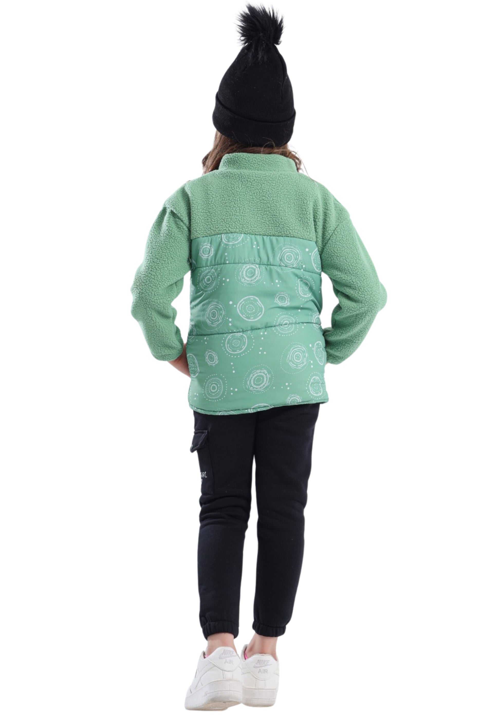 مكوّن من جاكيت فرو “Sherpa” بنقشة دوائر فنية، وتيشيرت قطن أبيض مطبوع بعبارة “Set goals & crush ’em”، مع بنطلون فليز بجيب كارغو جانبي يحمل شعار Zizo Girl.