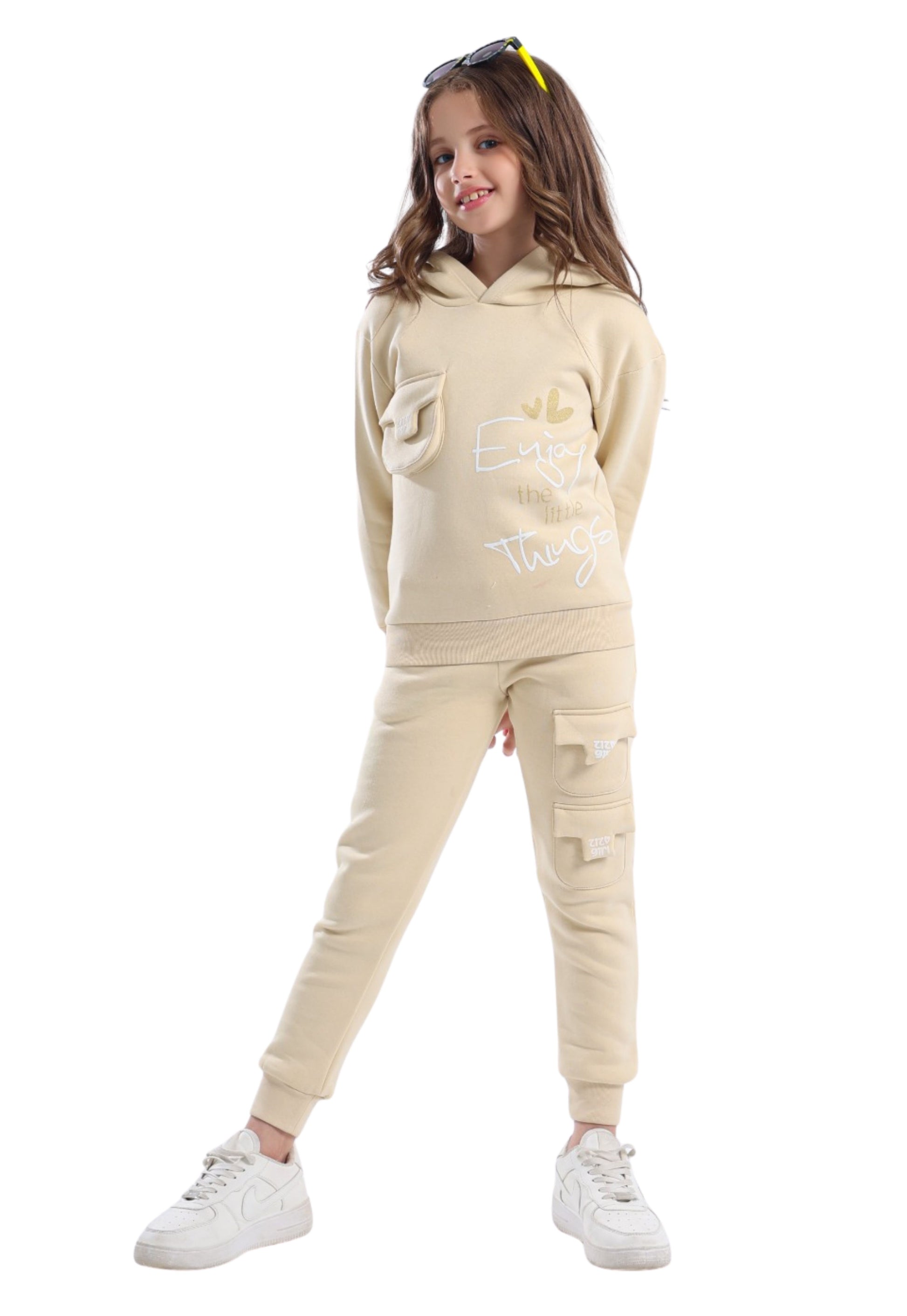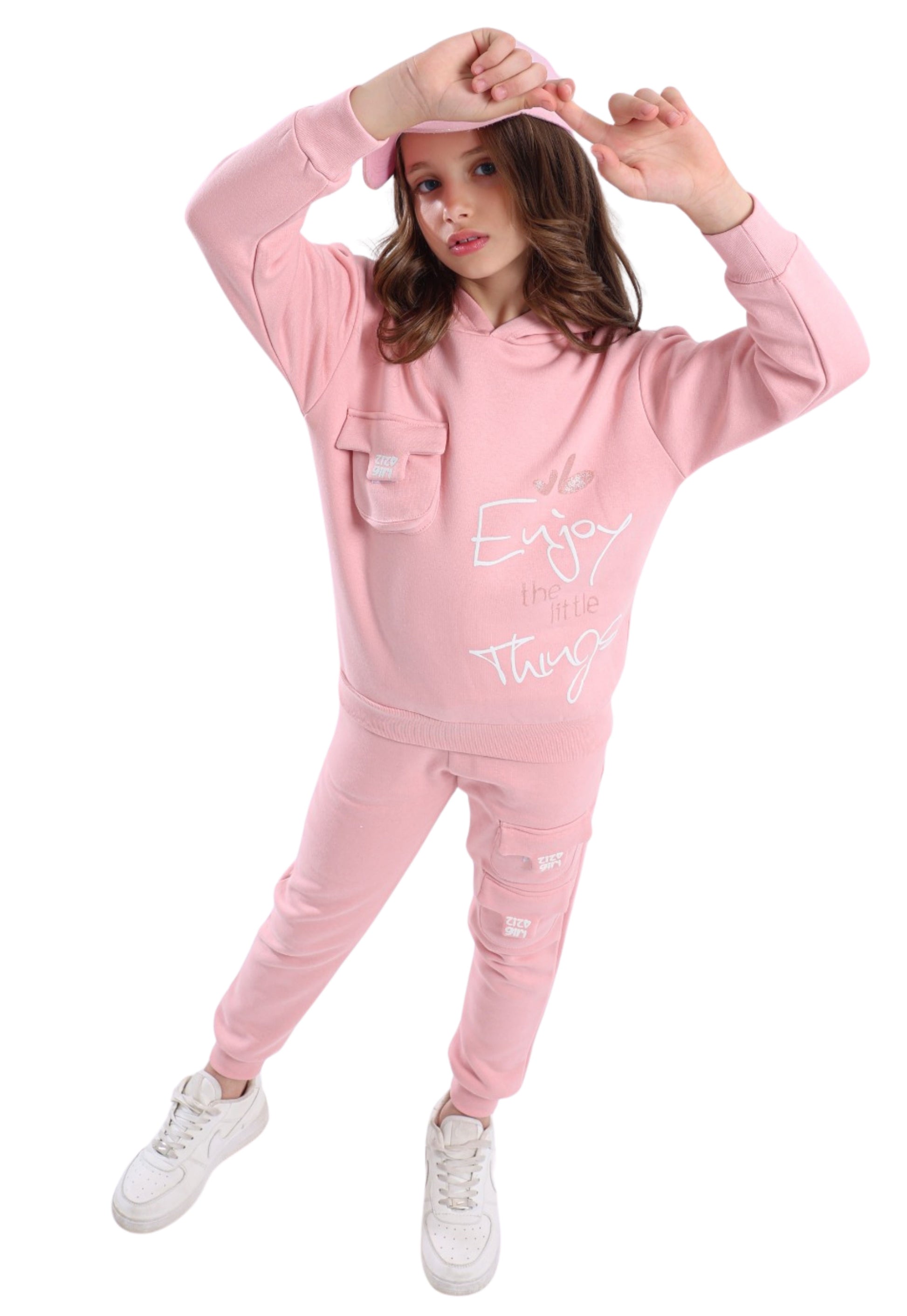 مكوّن من هودي بجيب أمامي بارز مطبوع عليه عبارة “Enjoy the Little Things”، مع بنطلون كارغو بجيوب كبيرة مطبوعة بشعار Zizo Girl.