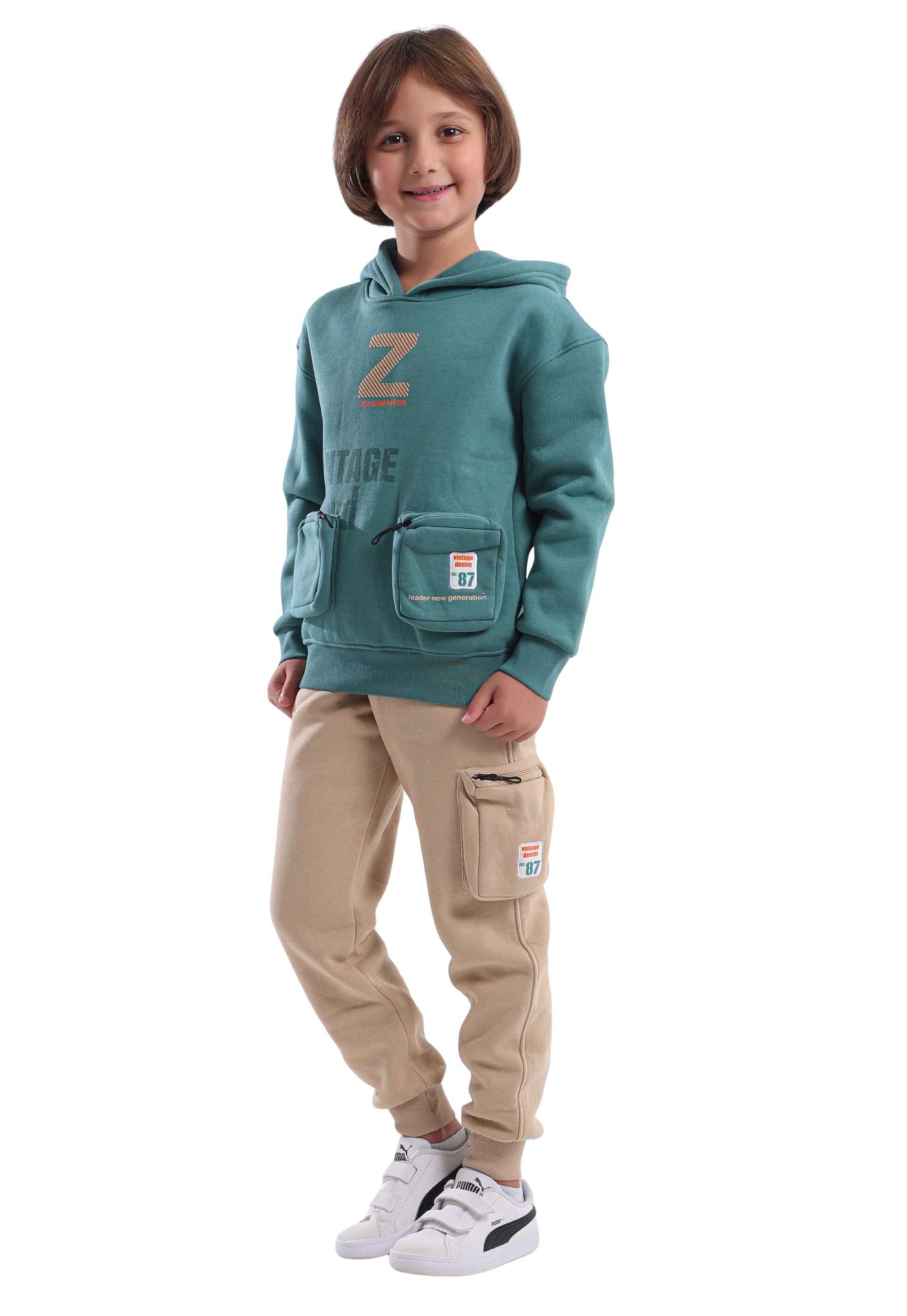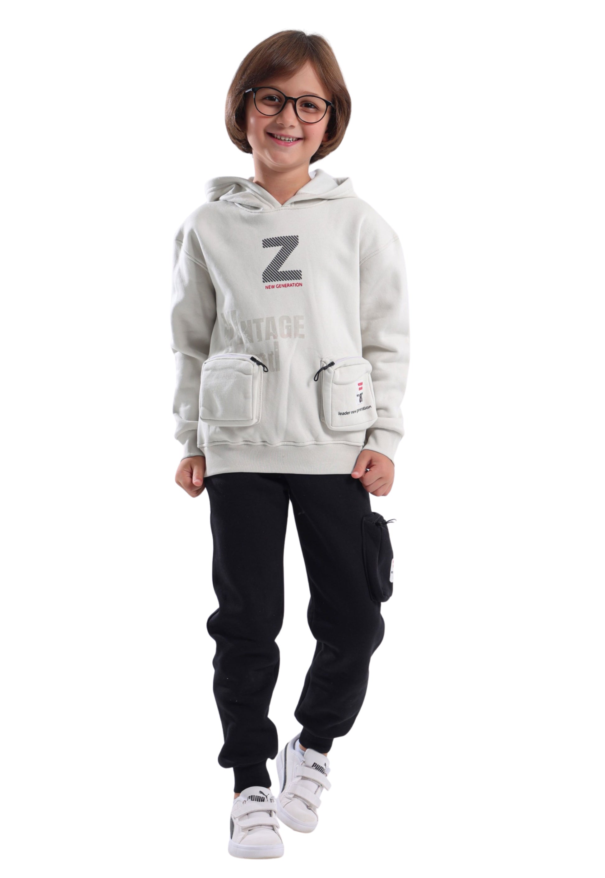 الطقم مكون من هودي بجيوب أمامية بسوستة وتصميم بارز بحرف Z وعبارة New Generation، مع بنطلون كارغو بجيب جانبي مطرز بنفس الهوية.